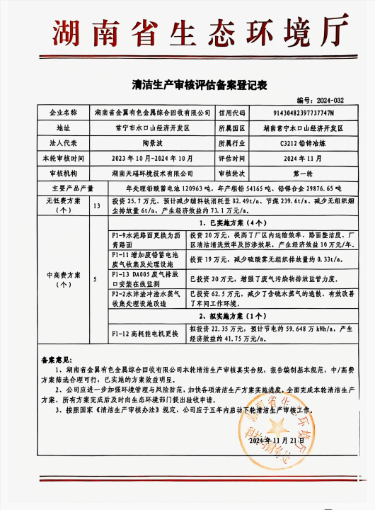 2022年,湖南金翼為響應國家發展綠色經濟理念的號召和大力發展再生資源產業、鼓勵資源綜合利用行業發展的指導思想,計劃充分利用本地資源和產業基礎優勢,擬在水口山經濟開發區產業園進行改擴建升級,提升企業原有廢鉛酸蓄電池回收利用能力到30萬噸,進一步推進廢鉛酸蓄電池回收再利用行業的發展和環保事業的可持續發展,將該擴建二期項目建設成行業一流的環保綠色低碳化的標桿工廠。